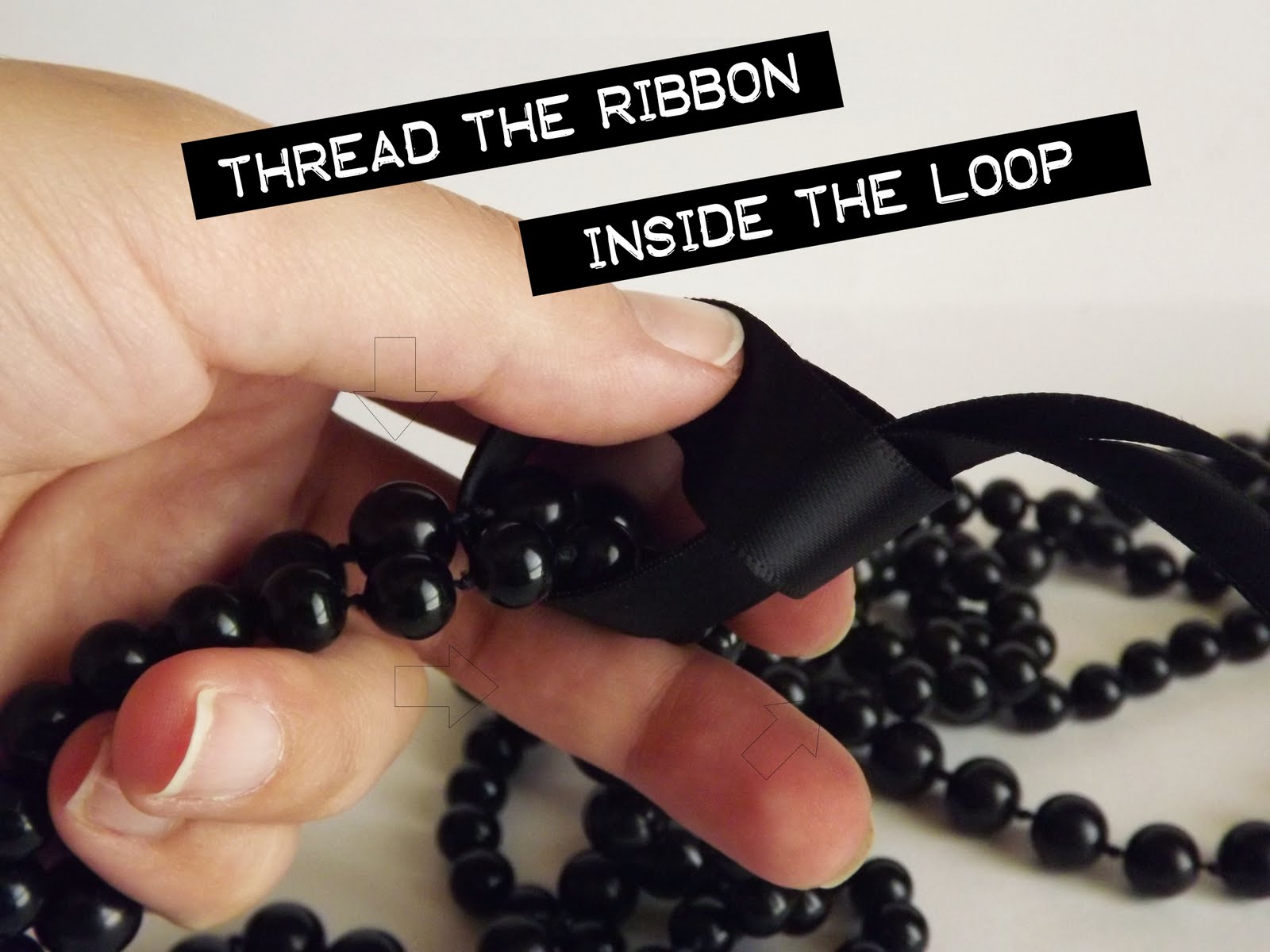 Fold in half the ribbon (to create a loop) and wrap the strings of beads