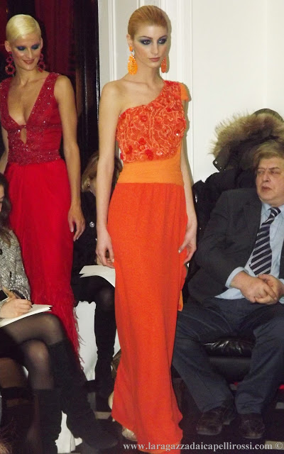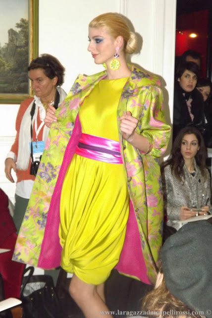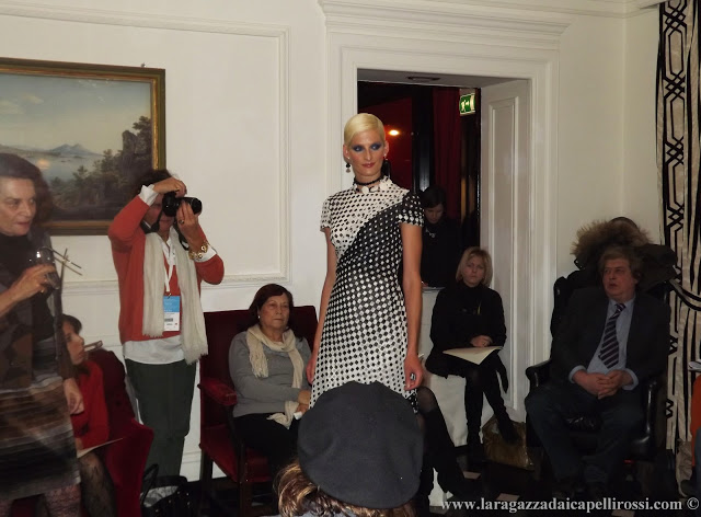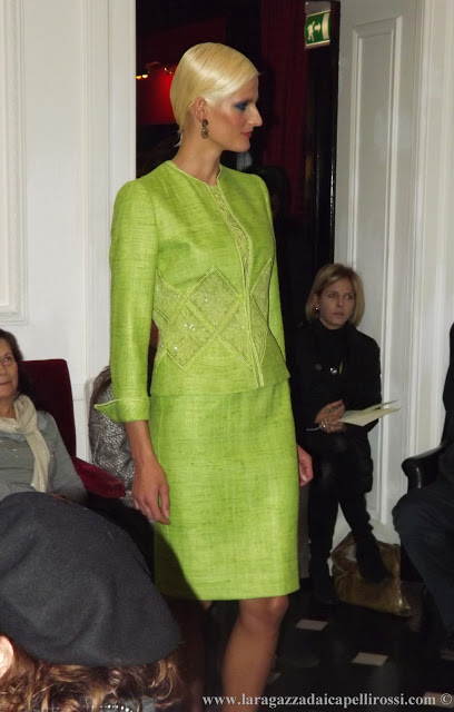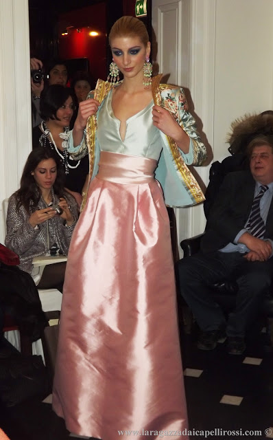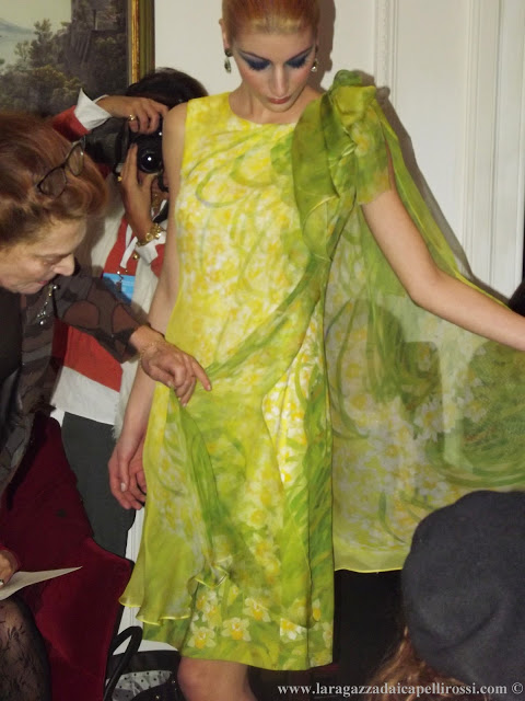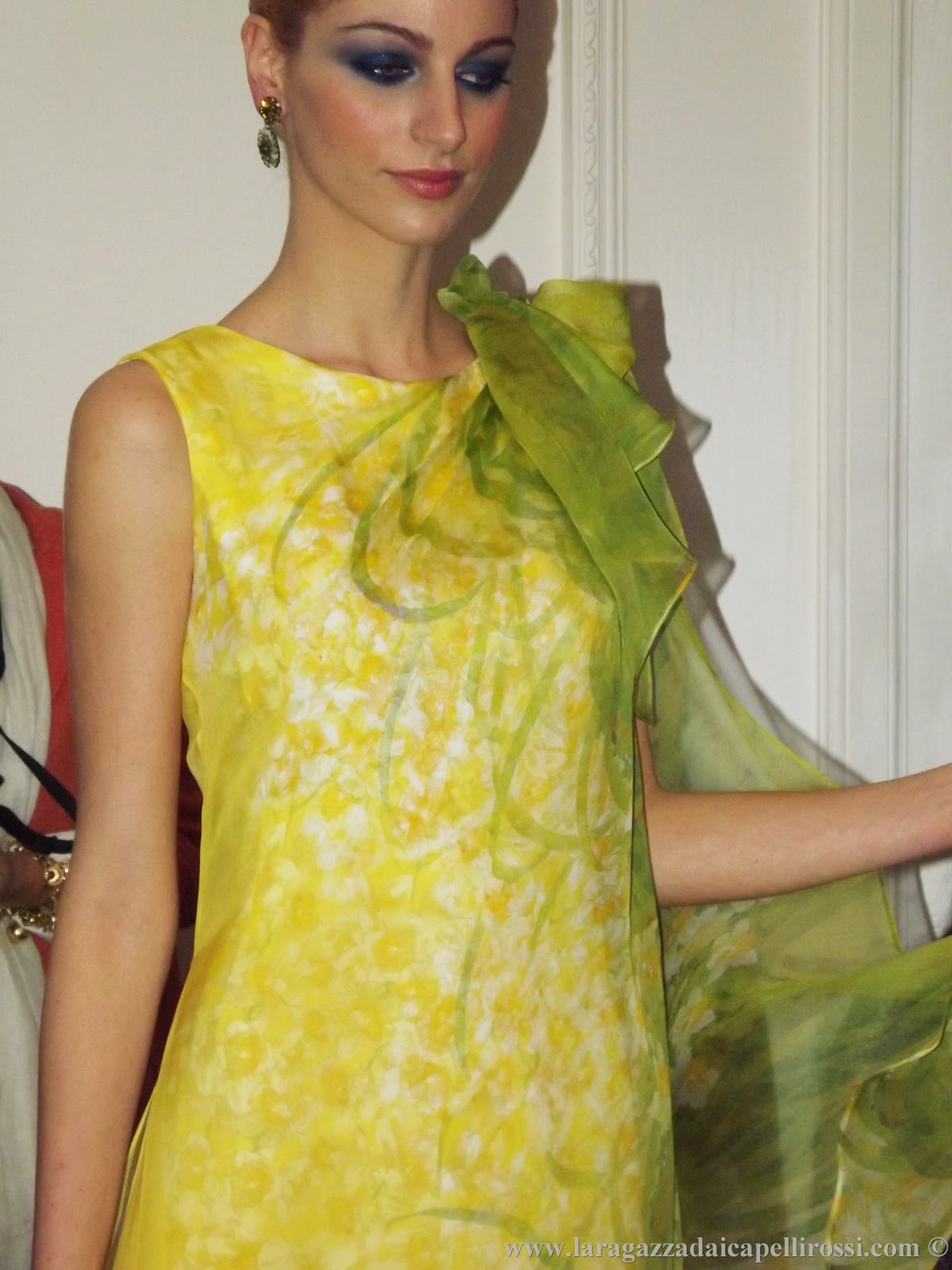 Particolarmente interessante la scelta dei tessuti e dei dettagli: crépe di lana, tele di seta e cotone, chiffon stampati e shantung, il tutto rifinito, come ci ha raccontato Raffaella, con passamanerie di fine ‘800 e bottoni vintage acquistati nei mercatini londinesi.