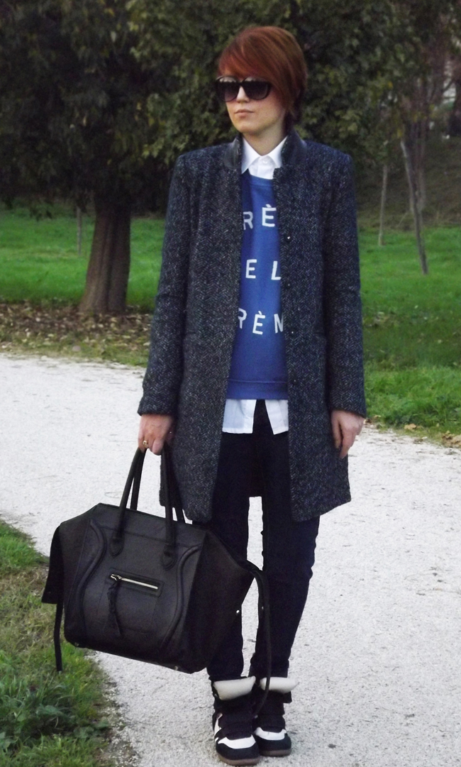 As I told you in this post I was waiting for the Zoe Karssen sweatshirt you can see here. It was sold-out on all the shops online but when it cames back available on Zoe Karssen official site I couldn’t miss it! I’ve chosen the blue one, perfect with jeans, my new H&M coat and my white and blue Isabel Marant. What do you think about this outfit? 🙂