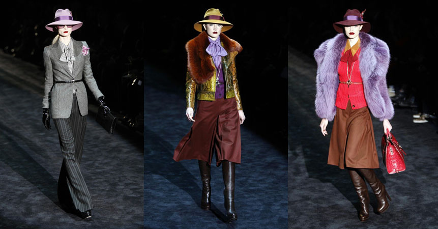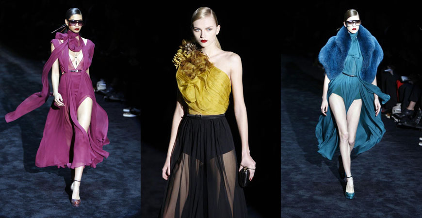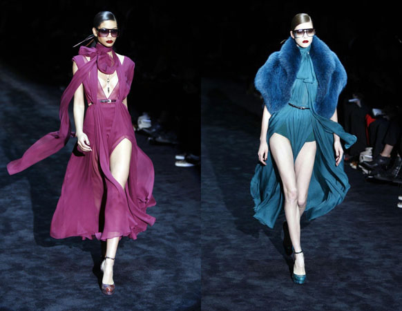 Per il prossimo autunno/inverno la maison ci propone accostamenti piuttosto insoliti: abiti leggeri in seta e taffetà abbinati a pellicce, lunghe e corte, dai colori sgargianti: verde petrolio, arancio, porpora e viola.