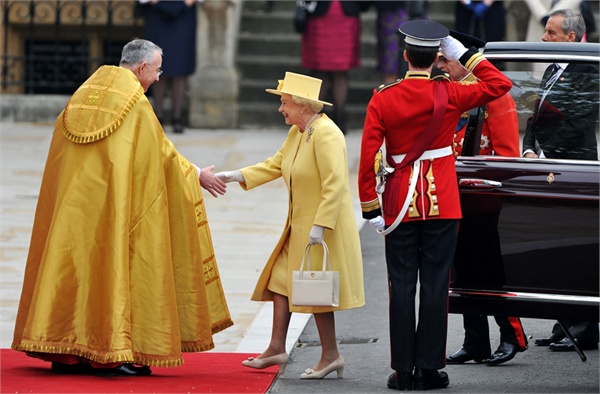 La Regina Elisabetta: siamo tutti abituati a vederla indossare colori improbabili, non vedo per quale motivo avrebbe dovuto smentirci proprio oggi. Eccola scendere dalla carrozza reale in total look giallo canarino… che Dio salvi la Regina…!