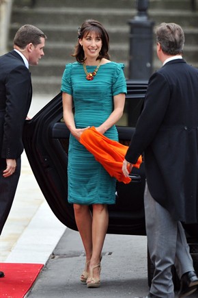 Samantha Cameron: (moglie Primo Ministro inglese) l’unica senza cappellino da matrimonio, una scelta apprezzabile. Mi piace molto il colore del vestito, un pò meno quella della stola. Il colour block ha contagiato anche lei?
