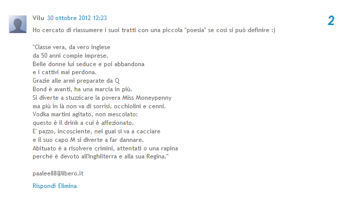 Non è stato affatto semplice decidere (tutti i vostri commenti erano fantastici!), ma ritengo che debba vincere il commento più originale, e credo che sia quello di Vilu che a James Bond ha dedicato persino una poesia!