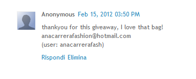 Il commento fortunato è il numero 322! (grazie a quei simpaticoni di Blogger che cambiano i codici ogni giorno ho dovuto contare i commenti manualmente), complimenti ad anacarrera!