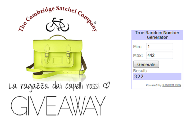 E’ arrivato il momento di proclamare il vincitore! 442 commenti sono davvero tanti, sono molto contenta che il giveaway sia stato gradito, vorrei poter regalare una borsa a tutte!!!! 🙁