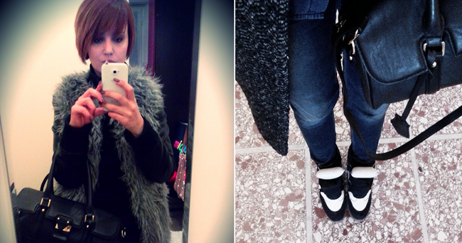 Due look a confronto: uno serale con un gilet in (finta) pelliccia e uno da giorno, con le sneakers Marant, per andare all’università. (ve ne segnalo un modello molto simile di Buffalo)