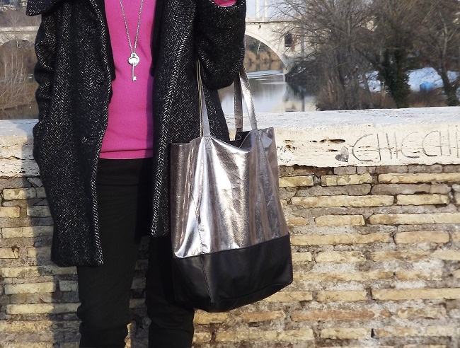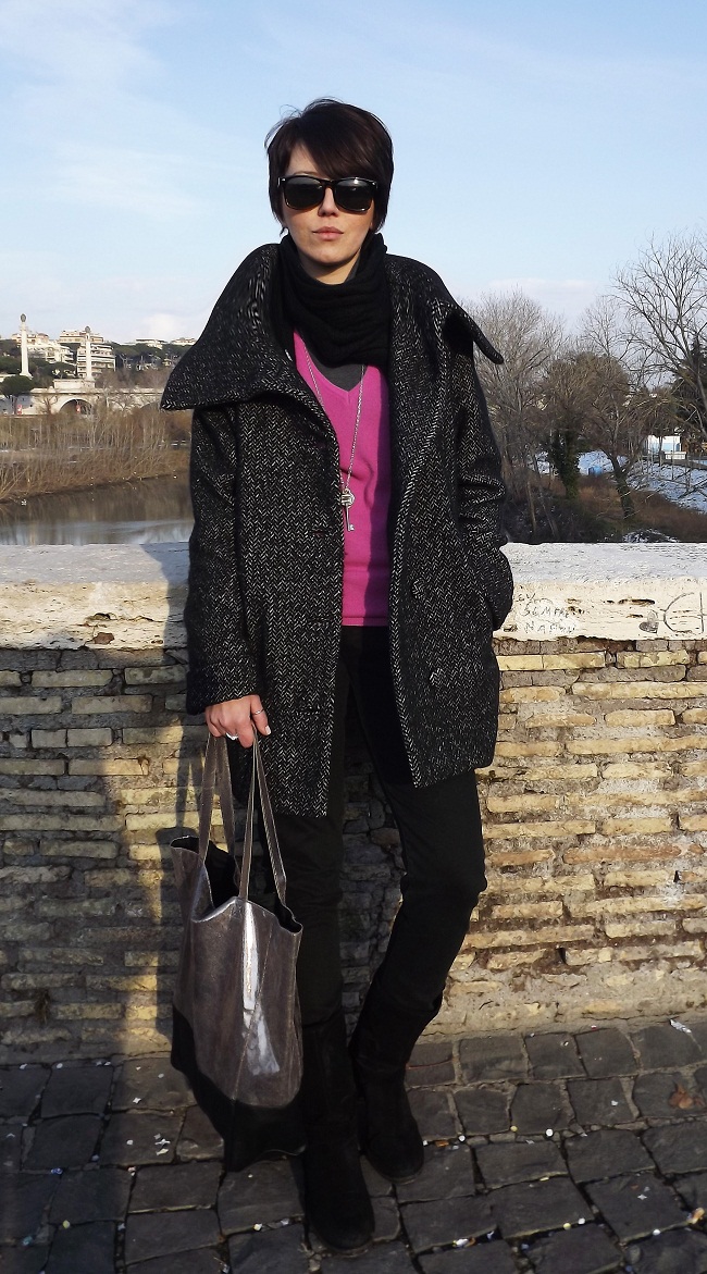 A casual outfit worn yesterday to go out and have a cup of hot chocolate. To defend myself from the cold I picked this fuchsia cachemire sweater, also perfect to break the total black look. What do you think about my bag? I take it during sales from Stradivarius, how much is comfortable? ๐