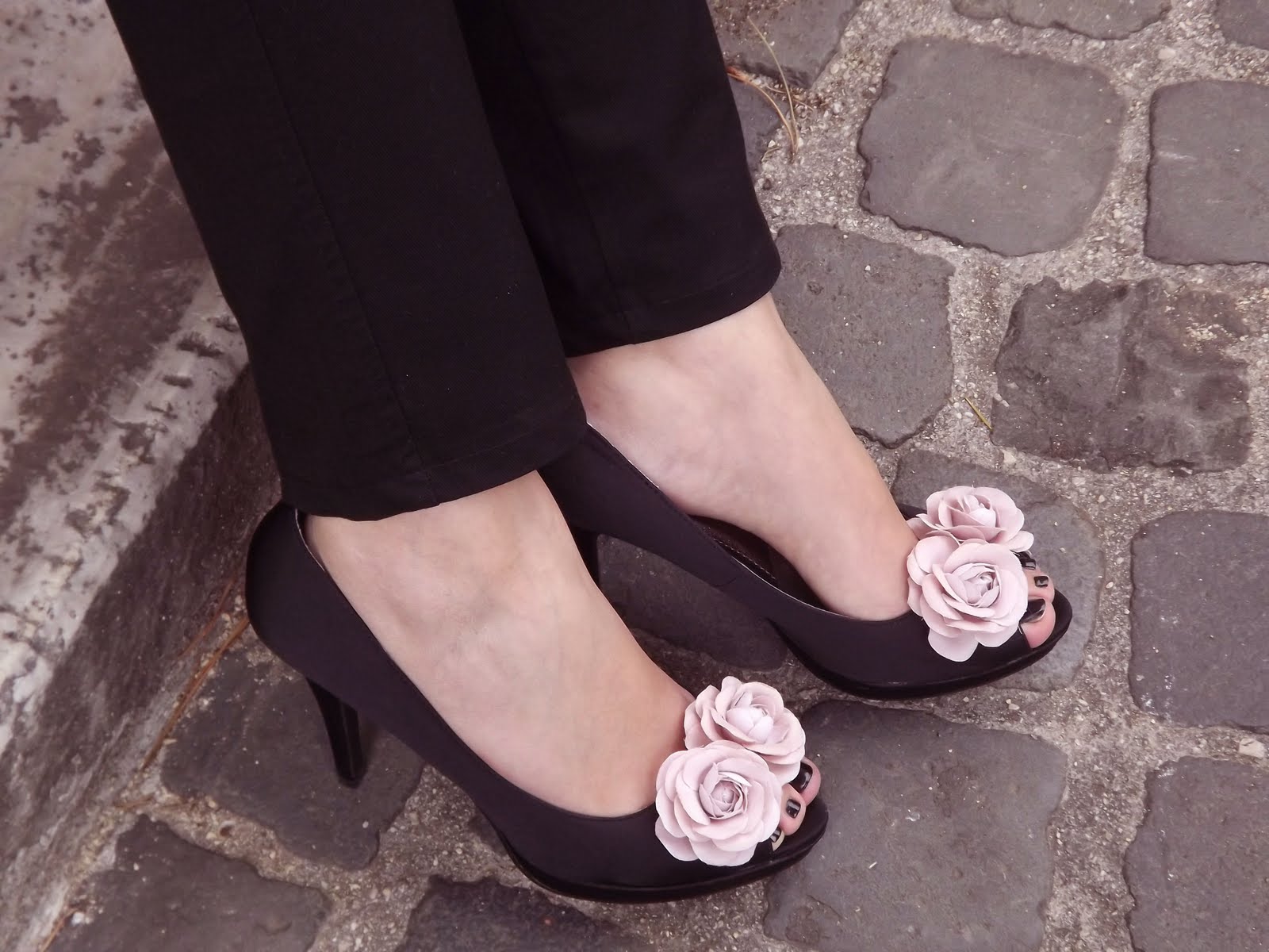 Finally the wedding day has arrived (and finished!), after the exhausting search for a look that doesn’t make me look like a big meringue (I hate those typical festive clothing!) here are some photos taken outside the church Saturday morning. How did you read HERE, I was looking for a pair of shoes colored powder, but for the reduced time and for the low budget, I had to fall back on simple tick in black satin. And it was their simplicity that made ​​me an idea: as you can see I applied two roses on the front, so as to resume the colors of the top and blazer. What do you think about them?